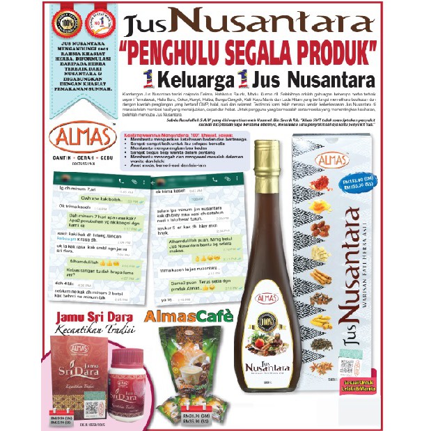 Jus Nusantara Almas Khasiat jus nusantara gold Jus nusantara testimoni Harga Jus Nusantara gold. HARGA PROMOSI JUS NUSANTARA ALMAS RM 130 2 FREE GIFT Isipada Jus Nusantara Almas. Pembuatan Jus Nusantara ini sangat bersih canggih moden dan dikilang di kilang yang bertaraf GMP Amalan Perkilangan Baik yang diluluskan oleh Kementerian Kesihatan Malaysia KKM Halal lagi Suci 100 keluaran Bumiputera dan tak perlu diragui lagi.